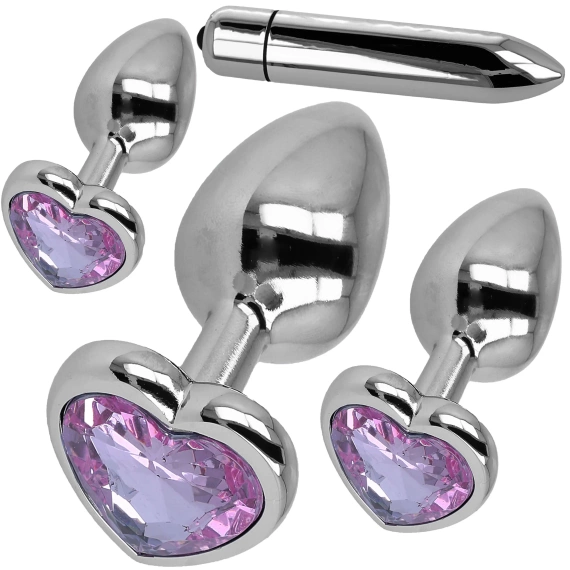 Ten luksusowy zestaw trzech metalowych korków analnych w różnych rozmiarach – S, M i L – to zaproszenie do odkrywania coraz intensywniejszych doznań. Wykonane z antyalergicznego aluminium, gwarantują pełne bezpieczeństwo i higienę. Każdy korek zdobi różowy kryształ w kształcie serca, który dodaje zabawie niezwykłej elegancji i zmysłowości. W komplecie znajdziesz także mini wibrator masażer, który urozmaici Twoje doznania i pozwoli eksplorować nowe formy przyjemności.